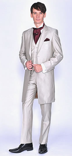| スラックス | 上着と共地。ロングタキシードもショートフロックコートともに現代のタイトめに見せる為にやや細めに作る事がポイント。 チーフ:白で麻かシルク素材のもの。 ソックス:白黒の縞が基本。または黒無地。 |
