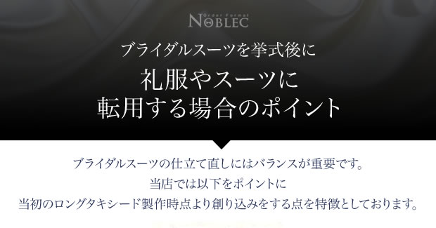 そこでノーブッレクのブライダルスーツは、挙式後にビジネススーツやブラックスーツに仕立て直しが可能になっております。