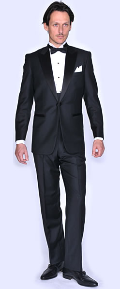 | 靴 | 黒のエナメルで内羽式のプレーントゥ、またはパンプス。タキシードは決して堅苦しいフォーマルスーツではありませんし、特別な場所へ着ていく服ではありません。実際、1つの釦のピークラペルのブラックスーツに拝絹とズボンに側章が付いてるだけと考えて頂ければ、心理的抵抗もを少なくなるのでないのでしょうか。とは言いましてもこれはだけはご理解しずらいかもしれませんのでタキシードの歴史と実際のご着用時の想定 Q&A を見てご理解の一助となればと思います。 |