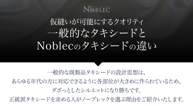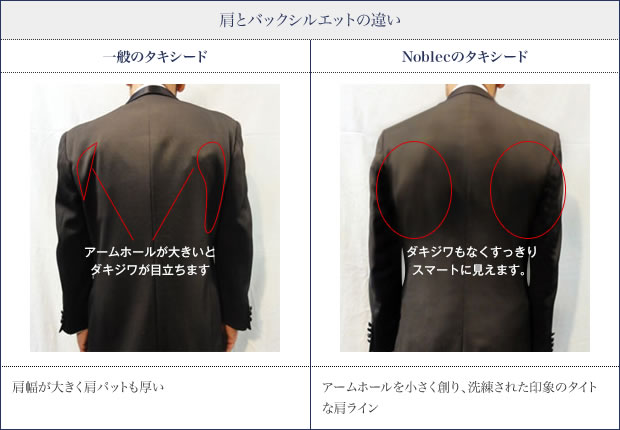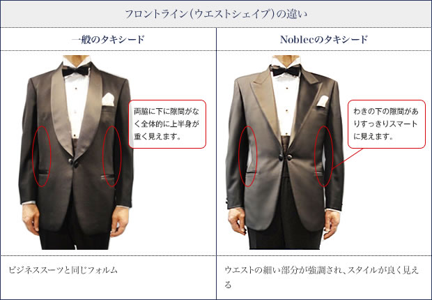 | ジャケット | 拝絹(はいけん:燕尾服・タキシードの衿の表に出る部分を覆い飾る絹で作られた部分のこと)が付いたピークドラペル型とショールカラー型があります。 |