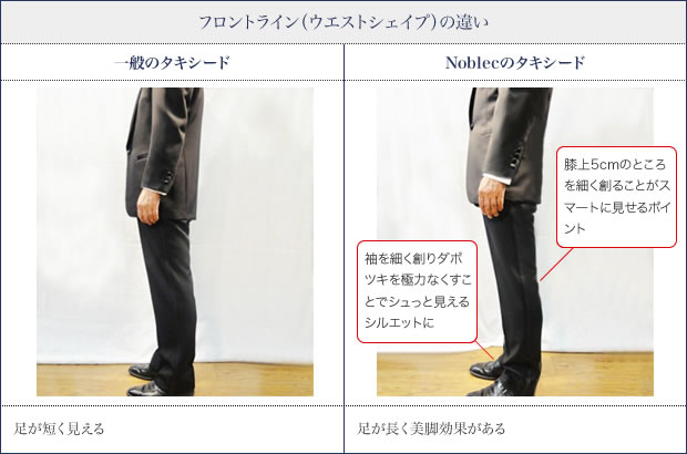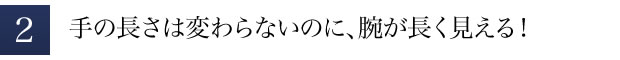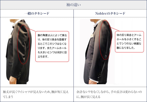 袖幅のゆとりを必要最小限に抑えて創るため、二の腕がスッキリ見えます。また、袖口からワイシャツが0.5~1センチ見えるようにすることで、清潔感がアップし、手の肌色が綺麗に見えます。