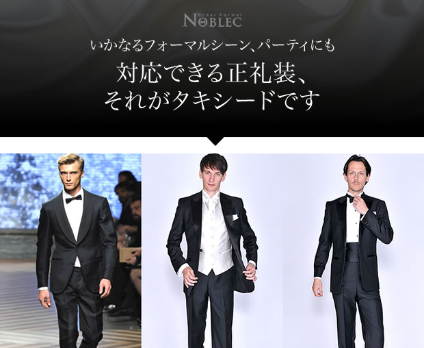タキシードは、正礼装としての装いの他にも、気楽なパーティの席で、さまざまなジャケットやパンツ、シャツ、小物を合わせて自分らしいコーディネイトを楽しむことができます。