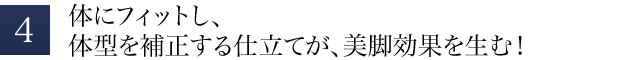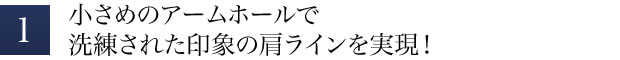 薄めの肩パットを使用することで、上半身をスマートに見せることができます。肩位置が高く見えるように仕立てるので、腕が長く見え、よりスリムになります。また、アームホールを小さめに創り、後ろ見頃のゆとりを必要最小限にすることで余分なシワがなくなり、全体的にシャープなイメージになります。