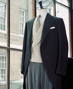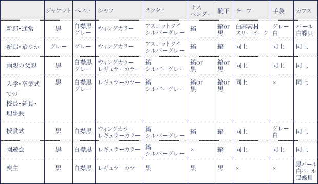 | アクセサリー | カフス:ゴールドまたはシルバーの台に、真珠・白蝶貝等の白石。 サスペンダー:黒または白黒の縞 チーフ:白で麻素材のものをスリーピークにして。 手袋:グレーの鹿革が正式。一般的には白手袋で。 ソックス:白黒の縞が基本または黒無地で。 |
