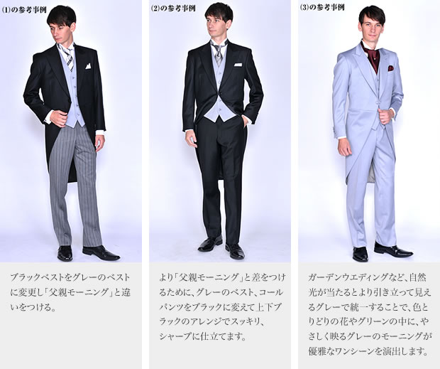 天皇陛下の公式な場での衣装としてのモーニングコートご着用に敬意を表して同じ着こなしをすることに由来し、レギュラーカラーのドレスシャツシルバーグレーの朱子か縞柄のネクタイ、ベストはグレーのダブルのものでも良いでしょう。 -