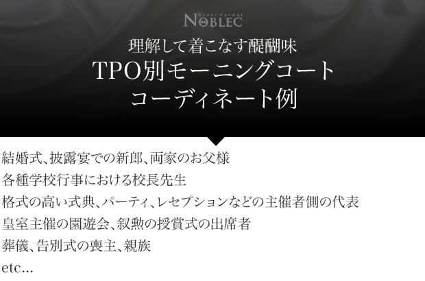 難しいモーニングコートの着こなし方やルールを知り尽くした上で、あなたの品格を引き出し、よりスマートに見せるモーニングコートをご提案。Noblecは豊富な専門知識がある当店だからこそ、安心してオーダーしていただくことができます。
