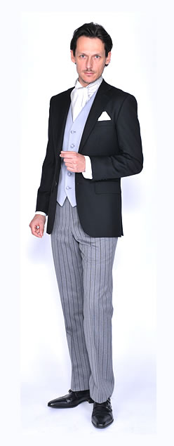 | ジャケット | シングルでもダブルでもOK。色は黒かダークグレー、濃紺の無地。ベントはノーベントと言われていますが、それは上記の様にそもそもの起源がダブルブレストスーツに由来している為と思われます。シングルで仕立てる場合は当店としては、センターベントをお勧めします。 |