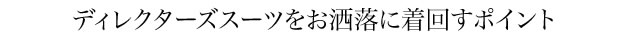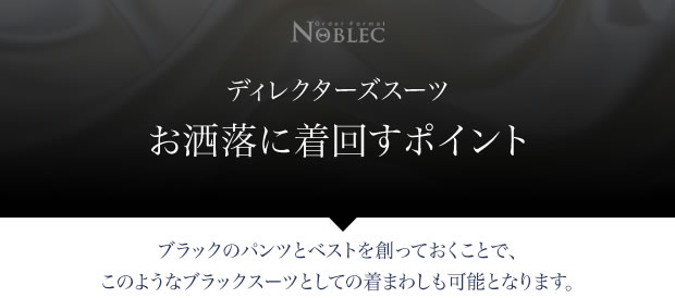 ディレクターズスーツは、フォーマルな場面でしか着られないと思われている方が多いと思いますが、実は合わせるパンツのデザイン次第で、ブラックスーツやビジネススーツとして利用することができます。